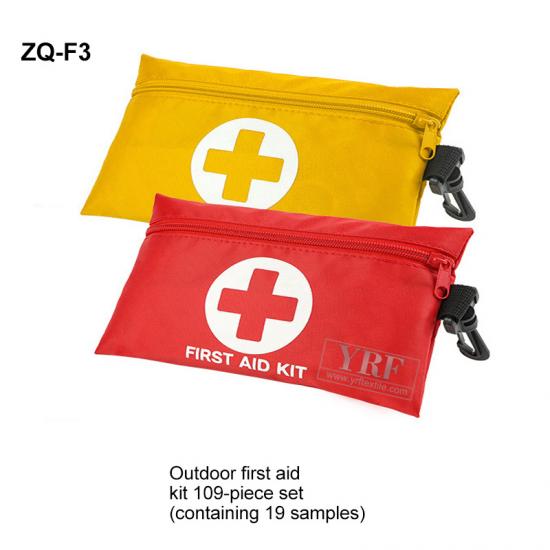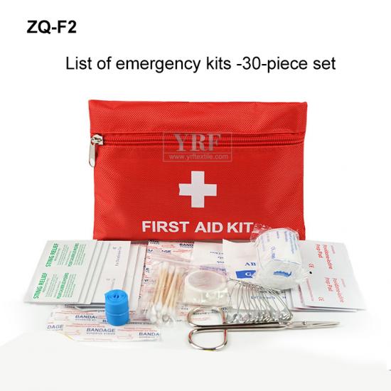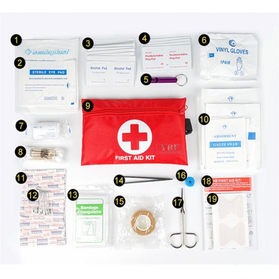 Podkładka do odsysania krwi *1, Podkładka pod oko *1, Tabletki z alkoholem *20, Tabletki jodoforowe *10, Gwizdek survivalowy *1, Rękawiczki jednorazowe *1, Bandaż PBT *1, Pałeczka higieniczna *30, Zestaw pierwszej pomocy *1, Gaza (trzy rozmiary) *6, Plaster *15, Agrafka *10, Bandaż trójkątny *1, Pęseta *1, Bandaż samoprzylepny *1, Opaska uciskowa *1, Nożyczki *1, Instrukcja *1, Plaster motylkowy *5, Taśma papierowa *1