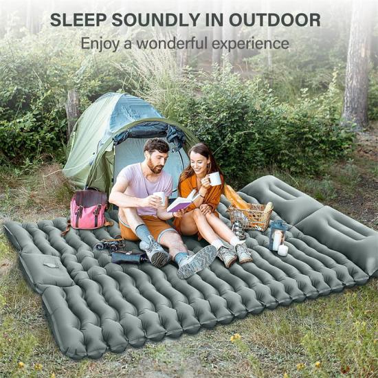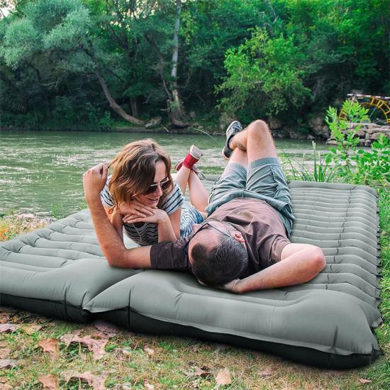 Dmuchany materac do spania jest lekki i zajmuje mało miejsca. Dzięki wbudowanej pompce i poduszce nie ma potrzeby
