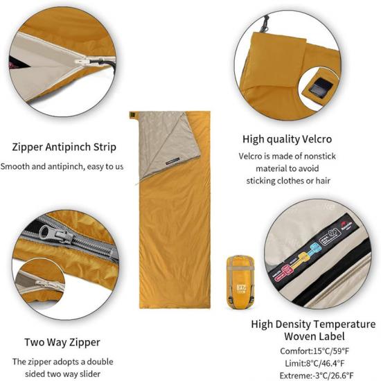 Śpiwór sprzedawany jest z pokrowcem i kompaktowym paskiem, który ułatwia jego przechowywanie i przenoszenie. Zamek błyskawiczny pozostaje zamknięty, a wnętrze wypełnione jest sztuczną bawełną jedwabną, aby zapewnić śpiworowi ciepło i wygodę. Śpiwór został starannie zaprojektowany i wykonany, aby wytrzymać lata rzeczywistego użytkowania.