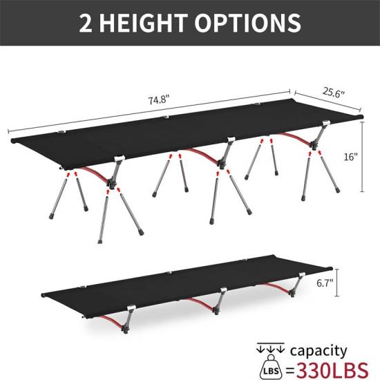 Cechą charakterystyczną tego składanego łóżka Disaster Relief Comfortable Folding Bed jest możliwość wyboru dwóch wysokości. Tryb niski nadaje się do użytku w namiotach lub na twardym podłożu o wysokości 17 cm, natomiast tryb wysoki idealnie sprawdza się na trawie, błocie i mokrym podłożu o wysokości 40 cm. Taka konstrukcja zapewnia użytkownikowi większą elastyczność w różnych warunkach terenowych.
