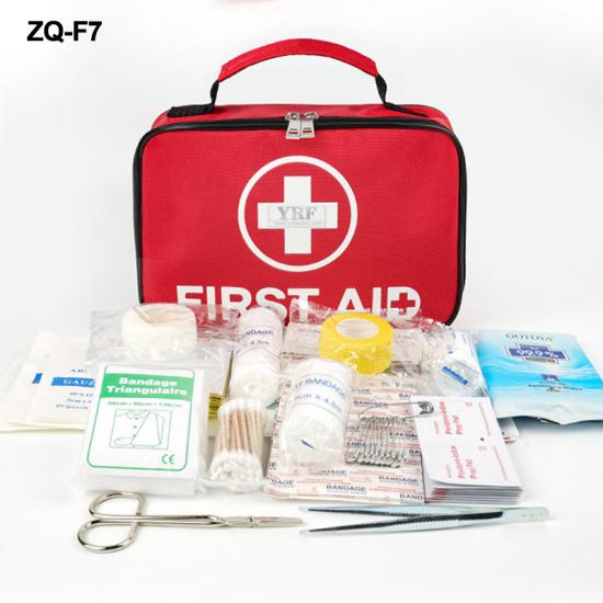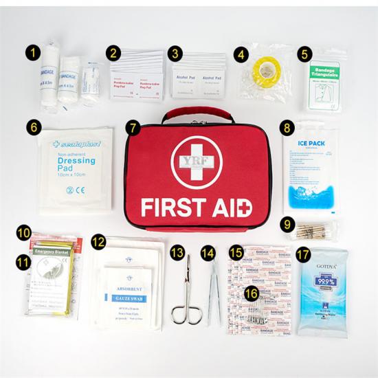 Taśma PBT *3, Tabletki jodoforowe *20, Tabletki z alkoholem *20, Plaster opatrunkowy *2, Bandaż trójkątny *1, Podkład hemostatyczny *2, Apteczka pierwszej pomocy *1, Wkład z lodem *1, Woreczek na patyczki higieniczne *1, Instrukcja użycia *1, Koc pierwszej pomocy *1, Gaza (trzy rozmiary) *6, Nożyczki *1, Pęseta *1, Plaster prostokątny *30, Agrafka *10, Chusteczki dezynfekujące *1