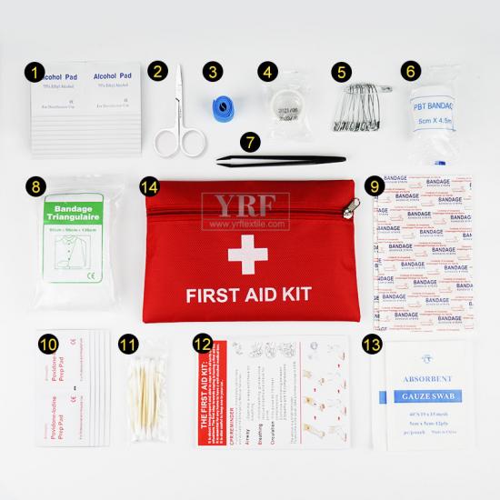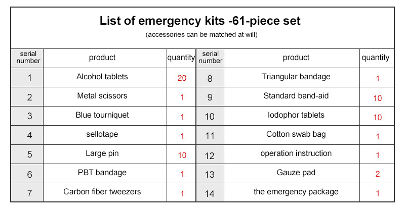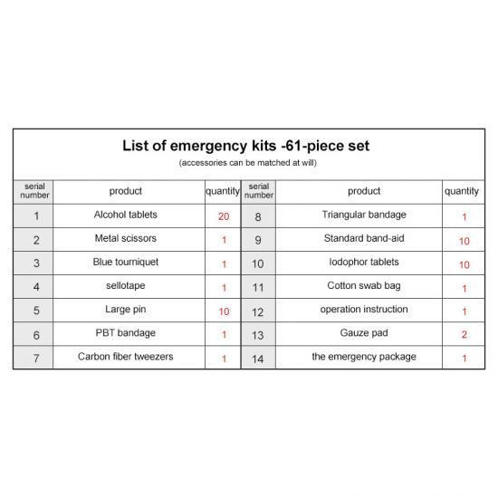 Tabletki z alkoholem *20, Nożyczki metalowe *1, Niebieska opaska uciskowa *1, Taśma *1, Duża szpilka *10, Bandaż PBT *1, Pęseta z włókna węglowego *1, Bandaż trójkątny *1, Standardowy plaster *10, Tabletki jodoforowe *10, Woreczek na patyczki bawełniane *1, Instrukcja użycia *1, Gazik *2, Zestaw ratunkowy *1 |