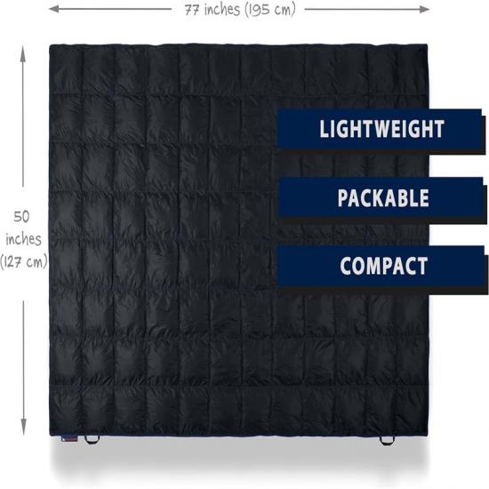 A: Dwuwarstwowy koc puchowy o wymiarach 56 x 150 cm, średniej grubości i niewielkiej wadze.