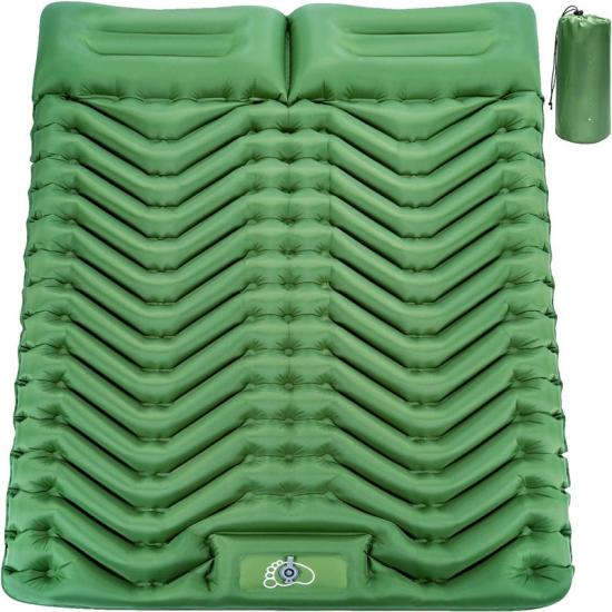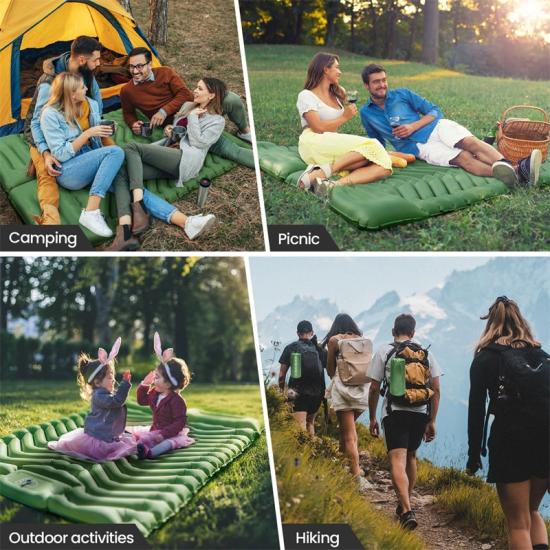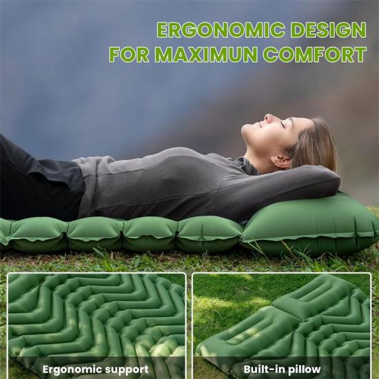 Dmuchany materac do spania jest lekki i zajmuje mało miejsca. Dzięki wbudowanej pompce i poduszce nie ma potrzeby
