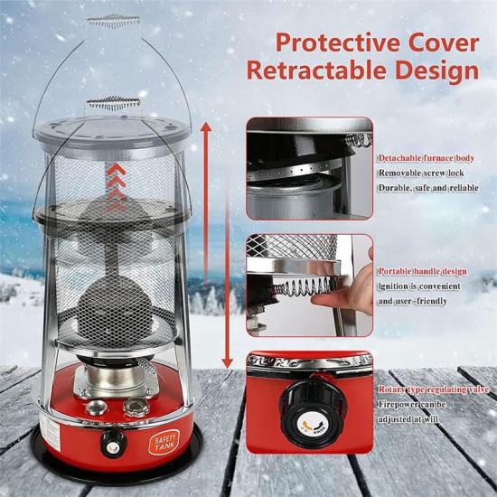 Ten awaryjny piecyk na naftę zapewnia ciągłe ciepło dzięki licznym zabezpieczeniom, takim jak wbudowany regulator płomienia, uszczelniony korek wlewu paliwa i kratka zabezpieczająca, co gwarantuje bezpieczne użytkowanie i długotrwałe źródło ciepła. Wskaźnik poziomu paliwa monitoruje go w czasie rzeczywistym, a zdejmowana, nietoksyczna emaliowana obudowa na górze ułatwia konserwację i czyszczenie. Cicha, energooszczędna i czysta praca pozwala użytkownikom cieszyć się ciepłem w bliskim otoczeniu, bez obaw o zużycie energii i zanieczyszczenie środowiska.