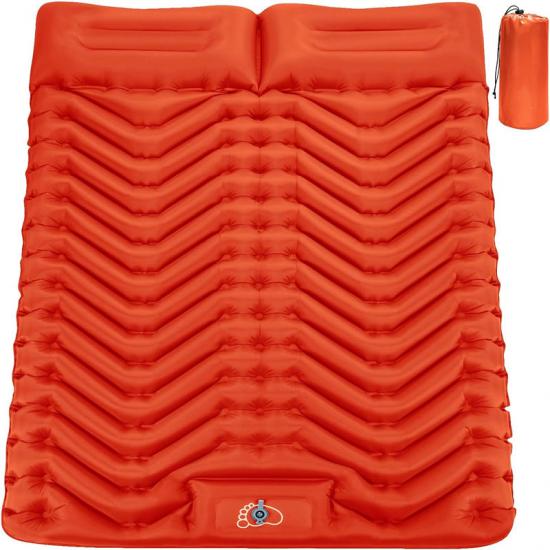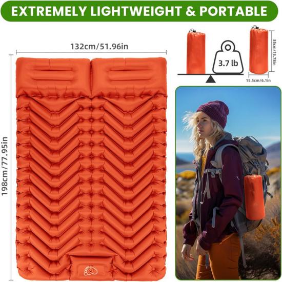 Ta podwójna, nadmuchiwana mata do spania ma wymiary 78 x 52 x 3,5 cala / 198 x 132 x 9 cm i waży zaledwie 3,7 funta / 1,6 kg.