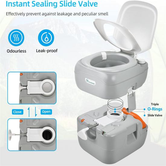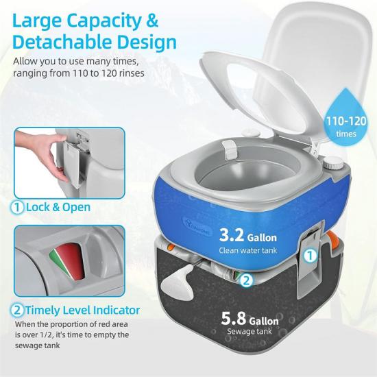 Cechy toalety awaryjnej o dużej gęstości Duża pojemność, wielokrotnego użytku: Ta awaryjna toaleta o dużej gęstości jest wyposażona w zbiornik na świeżą wodę o pojemności 3,2 galona/12 litrów i zbiornik na ścieki o pojemności 2,6 galona/10 litrów, co umożliwia wielokrotne użycie i pozwala zaoszczędzić czas i wodę.