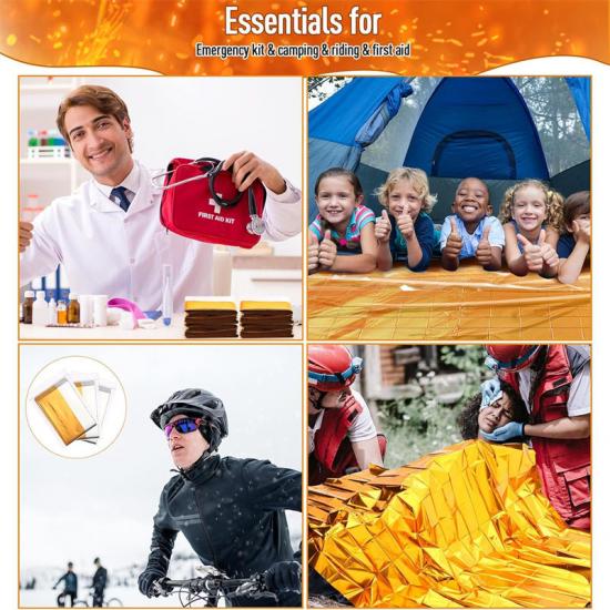 Łatwy do przenoszenia: Każdy Produkt ratunkowy Koc foliowy z folii aluminiowanej PET jest składany pojedynczo, pakowany i zamykany w kompaktowym opakowaniu o wymiarach około 13 x 7,5 cm i wadze około 60 g. Ten kompaktowy rozmiar pozwala na łatwe schowanie koca w plecaku lub kieszeni, dzięki czemu idealnie nadaje się do szybkiego użycia w nagłych wypadkach. Te wodoodporne i wiatroszczelne koce są również wielokrotnego użytku, trwałe i nadają się do długotrwałego użytkowania.