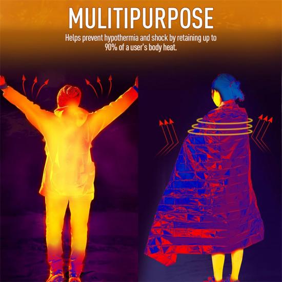 Wykonany z aluminiowanej folii PET, jest to praktyczny element zestawu przetrwania; całkowicie okrywa ciało, zapobiegając wychłodzeniu i wstrząsom, zatrzymując do 90% ciepła ciała użytkownika.