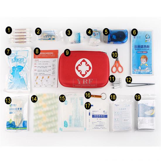 Chusteczki nawilżane * 10 sztuk/worek, Maska * 5, Bandaż trójkątny * 1, Prześcieradło bawełniane jodoforowe * 10, Tabletki z alkoholem * 20, Plaster przeciwgorączkowy * 1, Elastyczny cienki pasek PBT * 1, Maska do resuscytacji krążeniowo-oddechowej * 1, Esencja olejku wiatrowego * 1, Gaza * 2, Taśma * 1, Plaster z opatrunkiem * 12, Patyczki kosmetyczne * 1, Agrafka * 10, Pęseta 1, Opaska uciskowa * 1, Nożyczki * 1, Pilny pakiet edukacyjny * 1