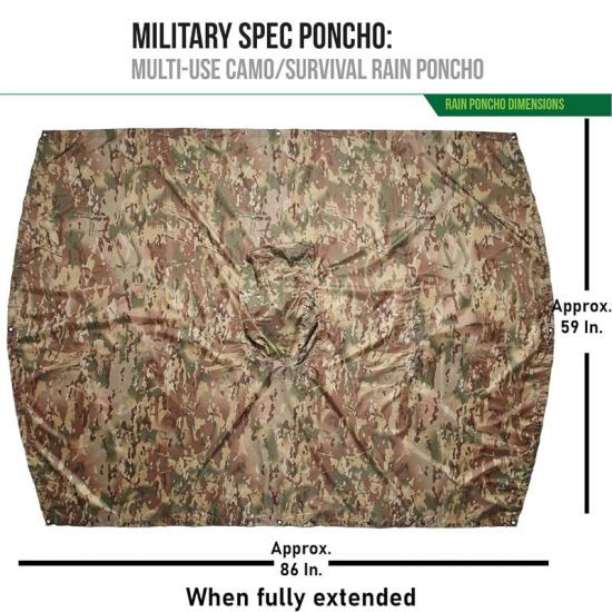 T Ponczo ma około 59" szerokości i 86" długości całkowitej, jest wystarczająco szerokie, aby pomieścić większe plecaki. Torba transportowa ma wymiary około 6" x 8" x 3". Ponczo waży 18 uncji, ale jest lekkie i łatwe do przenoszenia.
