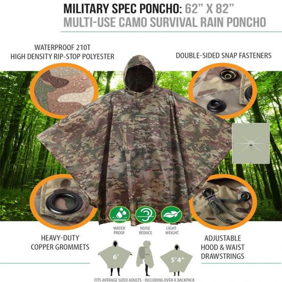 Wszechstronny namiot survivalowy z podszewką przeciwdeszczową sprawdzi się w sytuacjach kryzysowych, w wojsku, przy udzielaniu darowizn, pracach projektowych, dostarczaniu zapasów rządowych i innych sytuacjach. W sytuacjach kryzysowych trudne warunki pogodowe mogą prowadzić do powodzi, burz i innych katastrof, a wielofunkcyjna peleryna przeciwdeszczowa może zapewnić niezbędną ochronę, utrzymać suchość i zapobiec utracie ciepła. W operacjach wojskowych wielofunkcyjne ponczo może być używane jako tajny sprzęt taktyczny, redukując tarcie i hałas oraz zwiększając tajność operacji. W ramach darowizn i projektów wielofunkcyjne peleryny mogą być przekazywane jako zapasy awaryjne dla osób w potrzebie, aby pomóc im przetrwać trudne chwile. Wielofunkcyjna peleryna przeciwdeszczowa może być wykorzystywana jako jedno z długoterminowych zapasów w nagłych wypadkach.