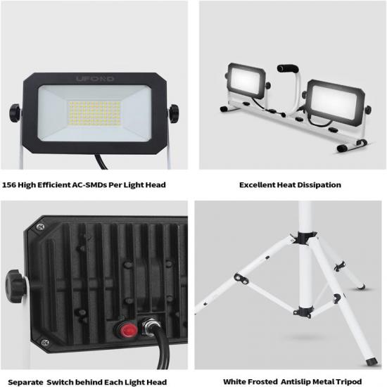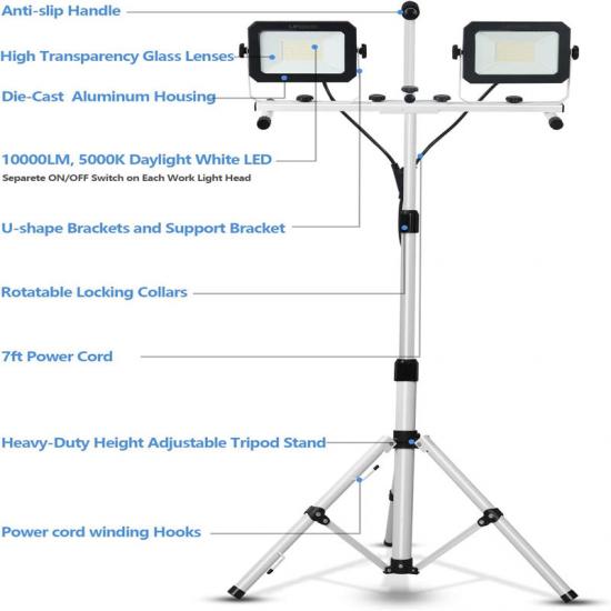 Oświetlenie awaryjne ma moc 5000 lumenów na głowicę i białe światło błyskowe o temperaturze barwowej 5000 K. Teleskopowy statyw o długości od 83 cm do 172 cm. Każda głowica może być obracana o 360° w poziomie i odchylana o 270° w pionie, aby dostosować kąt oświetlenia. Dwugłowicową lampę roboczą z uchwytem można odłączyć i używać samodzielnie, eliminując potrzebę stosowania statywu.