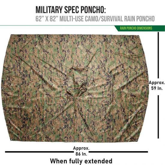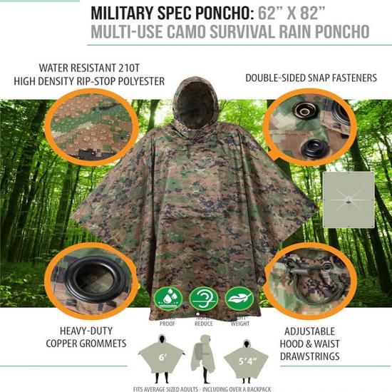 Wszechstronność: Wielofunkcyjna linia płaszczy przeciwdeszczowych została zaprojektowana z troczkiem w pasie, który umożliwia dodatkową regulację o 16 cali. Dodatkowo ponczo posiada 8 solidnych metalowych przelotek, które służą do zamocowania podszewki, zapewniając dodatkową izolację i umożliwiając łatwe przymocowanie sznurkiem. Wszechstronność tego poncza pozwala na jego wykorzystanie w różnych sytuacjach, jako parasola, namiotu survivalowego, zbiornika na wodę, noszy ratunkowych, pokrowca na hamak, przegrody namiotu, ekranu zapewniającego prywatność i ukrytego schronienia.
