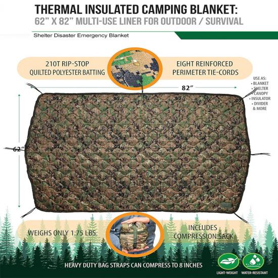 PRAKTYCZNOŚĆ: Ta duża, wiatroodporna podszewka typu poncho ma szeroki zakres zastosowań, może być używana jako szybko schnący tymczasowy namiot survivalowy, markiza, izolacja hamaka, poduszka, przegroda namiotu, ekran zapewniający prywatność, narzędzie do przenoszenia w nagłych wypadkach, pomoc w przypadku klęsk żywiołowych, ukryte schronienie, torba podróżna, śpiwór lub izolacja namiotu i tak dalej. Zapewnia dobre ciepło i ochronę zarówno podczas użytkowania indywidualnego, jak i grupowego.