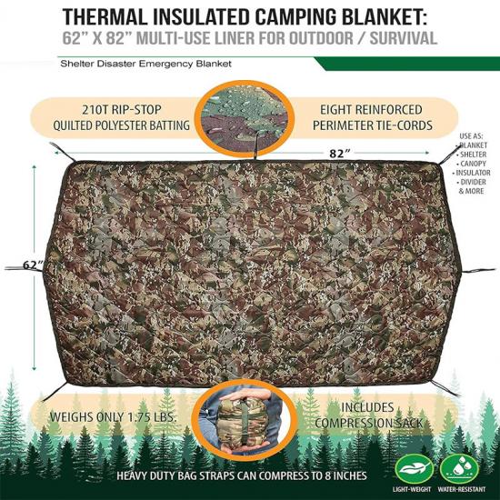 PRAKTYCZNOŚĆ: Ta duża, wiatroodporna podszewka typu poncho ma szeroki zakres zastosowań, może być używana jako szybko schnący tymczasowy namiot survivalowy, markiza, izolacja hamaka, poduszka, przegroda namiotu, ekran zapewniający prywatność, narzędzie do przenoszenia w nagłych wypadkach, pomoc w przypadku klęsk żywiołowych, ukryte schronienie, torba podróżna, śpiwór lub izolacja namiotu i tak dalej. Zapewnia dobre ciepło i ochronę zarówno podczas użytkowania indywidualnego, jak i grupowego.