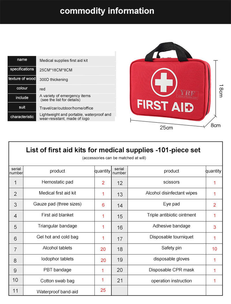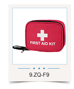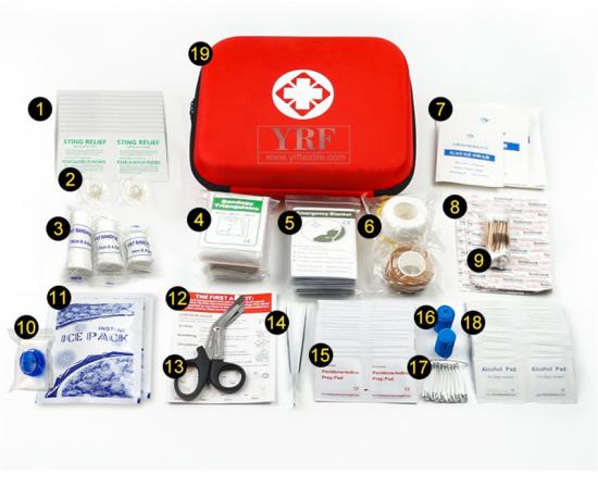 Tabletka Zhiyang *20, Taśma *2, Bandaż PBT (trzy rozmiary) *3, Bandaż trójkątny *2, Koc pierwszej pomocy *2, Plaster samoprzylepny *2, Gaza (trzy rozmiary) *6, Wodoodporny plaster *20, Pałeczka kosmetyczna *30, Osłona do resuscytacji krążeniowo-oddechowej *1, Wkład chłodzący *1, Instrukcja użycia *1, Nożyczki *1, Pęseta *1, Tabletki jodoforowe *20, Jednorazowa opaska uciskowa *2, Szpilka *10, Tabletki z alkoholem *50, Przenośny pakiet ratunkowy EVA *1