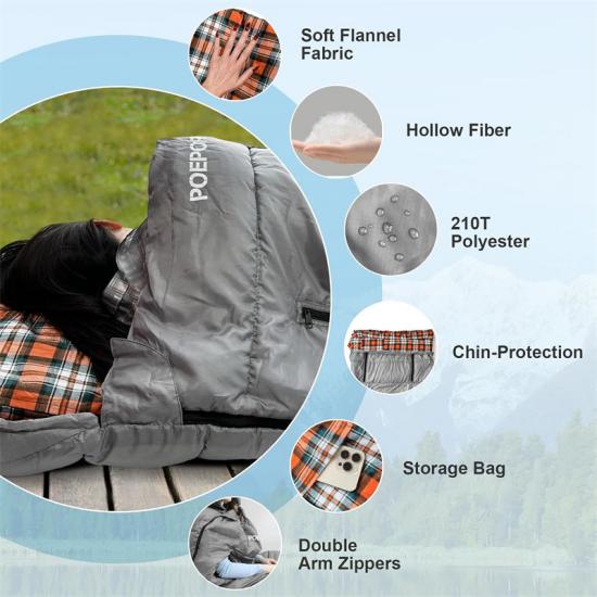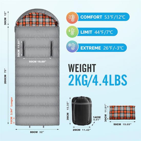 Nasz wodoodporny śpiwór o wymiarach 79+12 cali (32 cale) / 200+30 cali (81 cm) wykonany jest z wysokiej jakości, wodoodpornej, poliestrowej tkaniny w kratę 210T, która zapewnia doskonałą odporność na zachlapanie i suchość nawet w trudnych warunkach pogodowych. Wewnętrzna warstwa wykonana jest z miękkiego i przytulnego materiału, który zapewnia komfortowy sen nawet w chłodne noce.