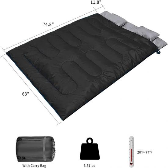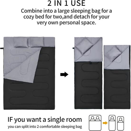 Rozmiar śpiwora przeciwpowodziowego wynosi 63*86,6" / 160*230CM, a przestronny, prostokątny kształt zapewnia maksymalny komfort, nadaje się na 3-4 pory roku, a znamionowa temperatura wynosi 5℃-25℃.