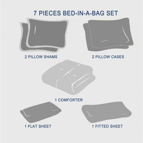 A: Pościel poliestrowa United Nations Donate Bedding zawiera 1 kołdrę o wymiarach 230 x 260 cm, 2 poszewki na poduszki o wymiarach 50 x 90 cm, 1 prześcieradło o wymiarach 270 x 260 cm, 1 prześcieradło z gumką o wymiarach 200 x 200 + 35 cm oraz 2 poszewki na poduszki o wymiarach 50 x 100 cm.
