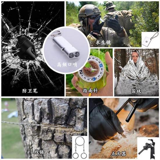 przetrwanie sprzęt, taki jak koce ratunkowe, nożyczki, gwizdki i wielofunkcyjne karty kieszonkowe, naciśnięcie lampy błyskowej